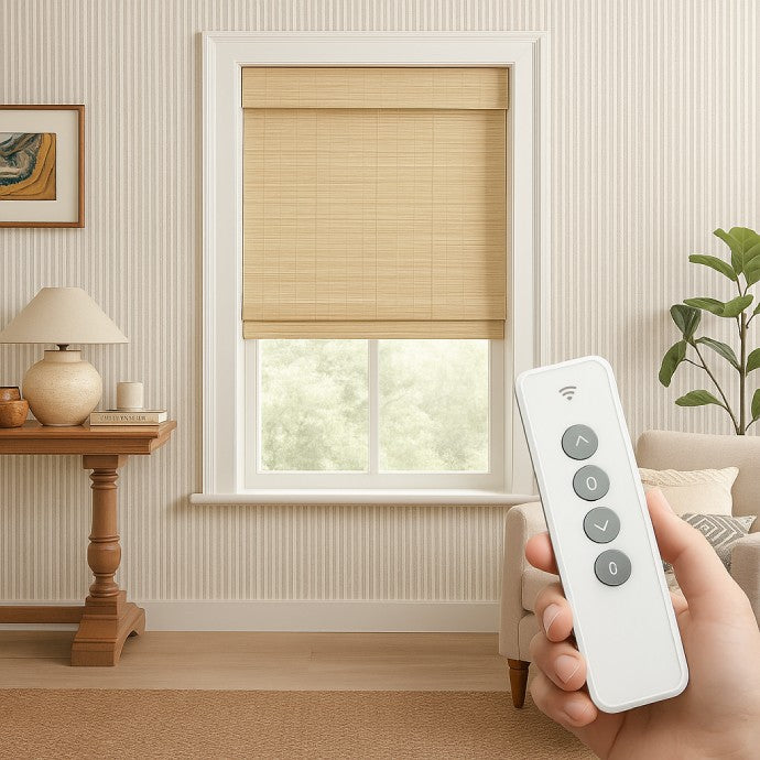 MorraHome Bamboo Roman Shades offer Cordless Lift and Motorized Control to keep homes uncluttered look —no messy cords or chains.